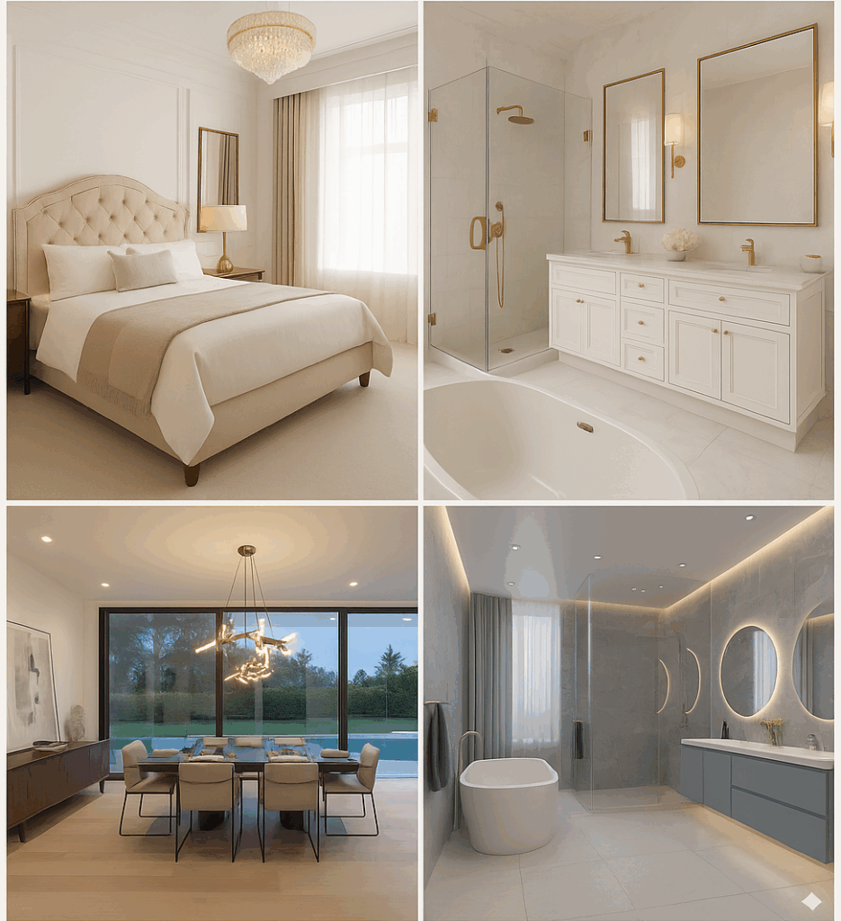 • Soft-Tone Wall Finishes: Smooth, matte, or satin paints in calming neutral shades.